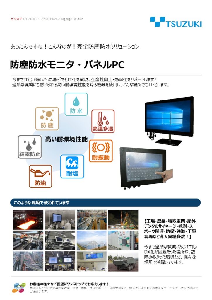 『完全防塵防水モニタ・パネルPC』は、過酷な環境にも耐えられる高い耐環境性能を誇る機器を使用し、どんな場所でもIT化します。