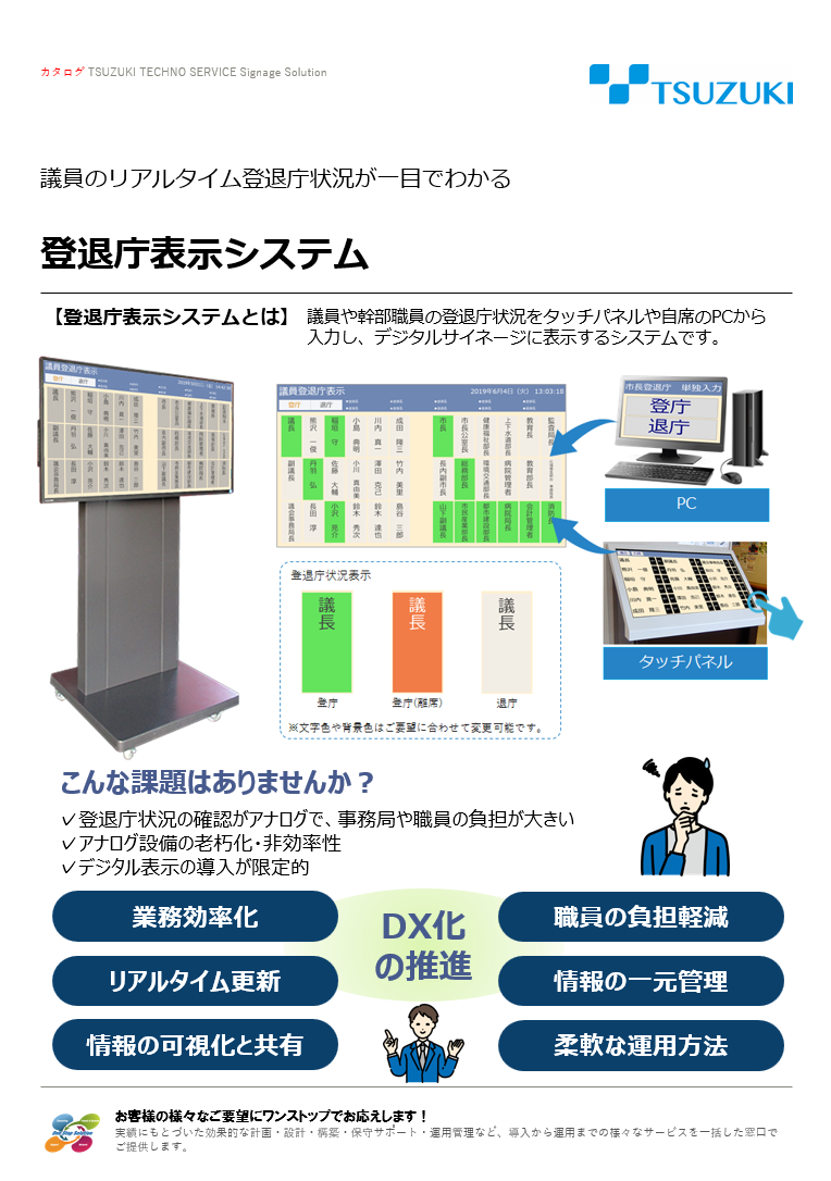 『登退庁表示システム』は、議員や幹部職員の登退庁状況をタッチパネルや自席のPCから変更し、デジタルサイネージに表示します。