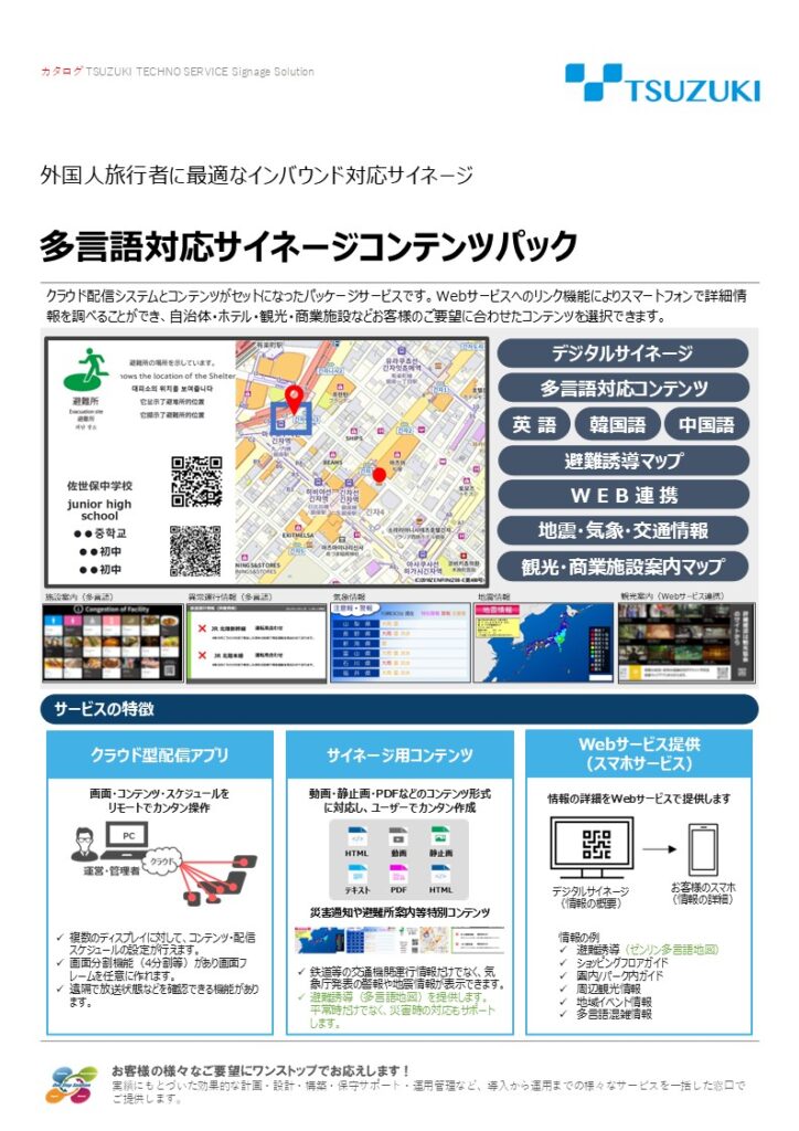当社では、クラウド配信システムとコンテンツがセットになった「多言語対応サイネージコンテンツパック」をご提供しております。