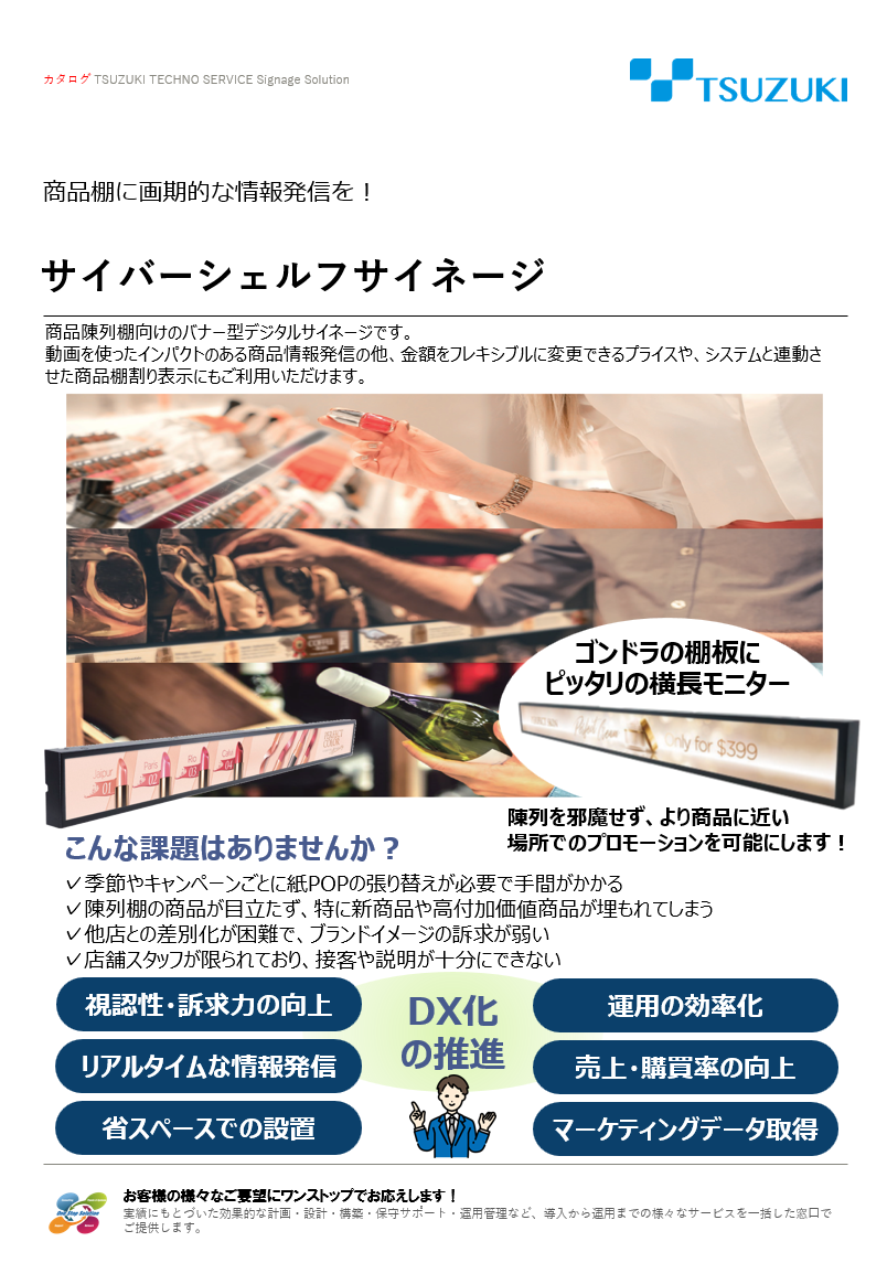 『サイバーシェルフサイネージ』は、ゴンドラの棚板にピッタリの横長モニターです。