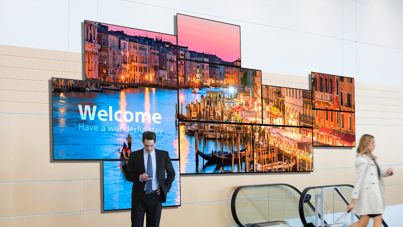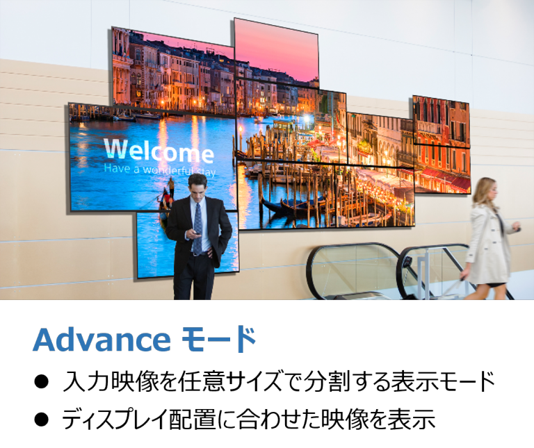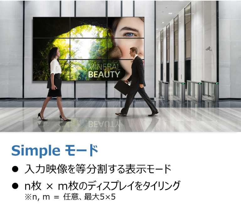 マルチディスプレイ表示ではMDS機能によりサイズがバラバラな組み合わせでもコントローラーなしでマルチ構成が組めるため、企業のエントランスやショールームにおける空間映像を演出します。