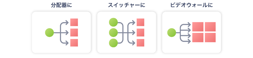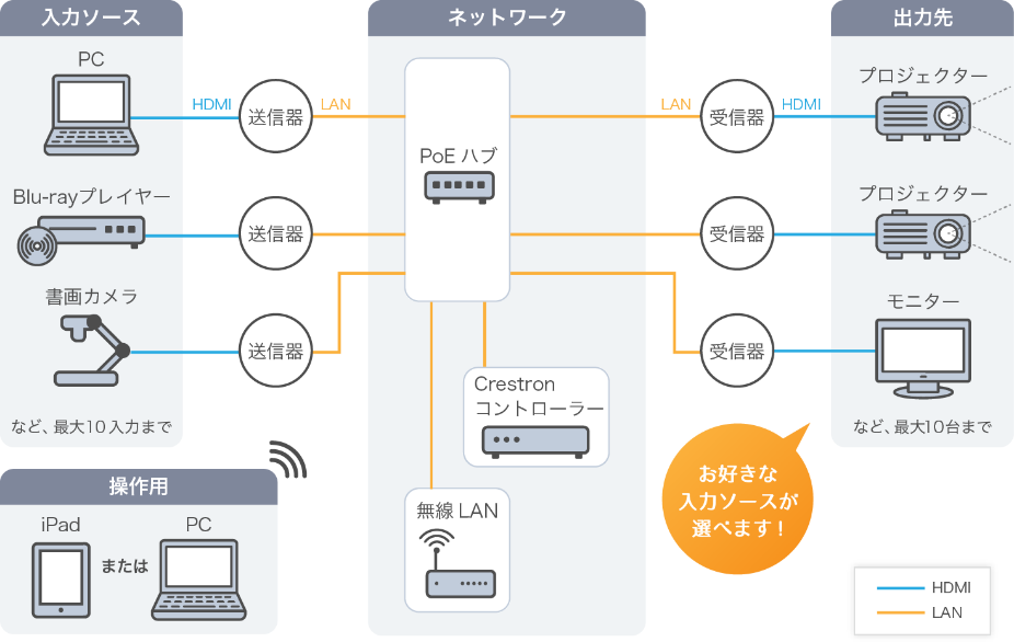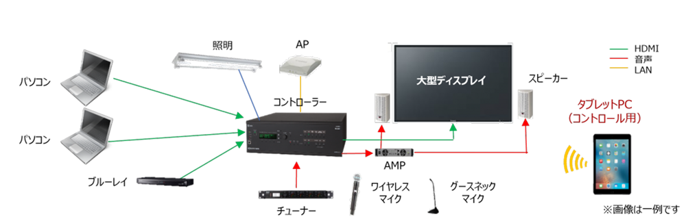 - LAN経由で映像・音声を伝送し、機器の増減やレイアウト変更にも対応しやすい