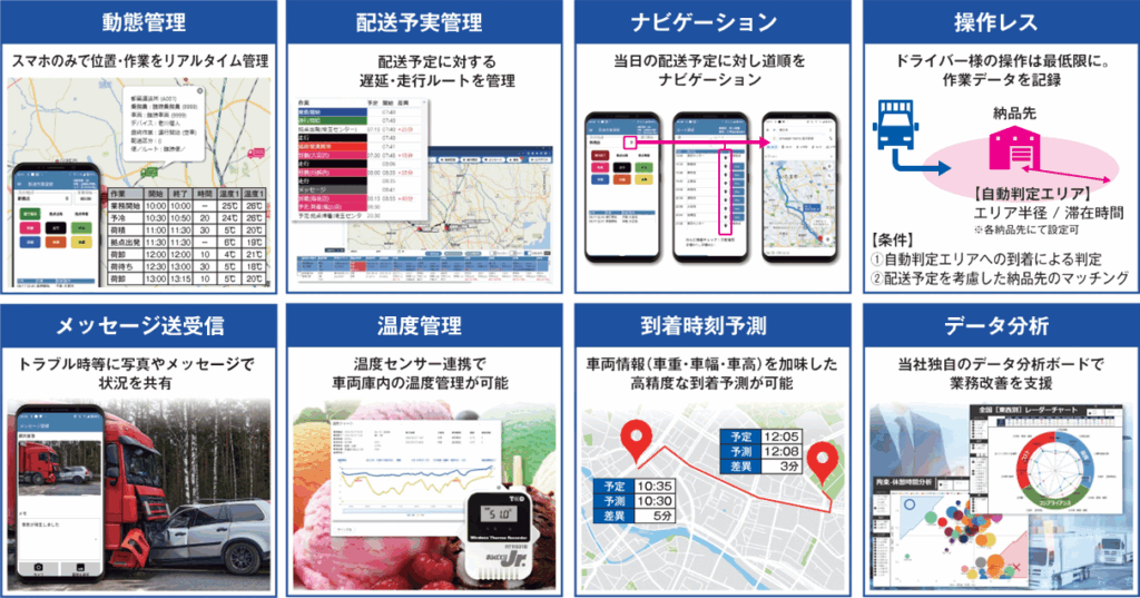 高度な予実管理・到着時刻予測・ナビ・日報・データ分析など、配送業務に必要な機能を実装しています。